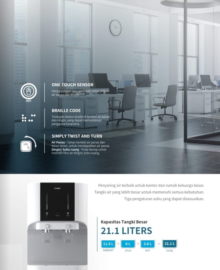 - Kapasitas Tangki Terbesar: Coway Core memiliki total kapasitas tangki hingga 21,1 liter. Oleh sebab itu, Anda tidak perlu khawatir kekurangan air meskipun banyak orang menggunakannya secara bersamaan.