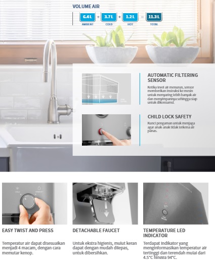 - Empat Temperatur Air: Anda bisa mendapatkan air panas, dingin, suhu ruangan, hingga air hangat suam-suam kuku hanya dalam satu putaran tuas.