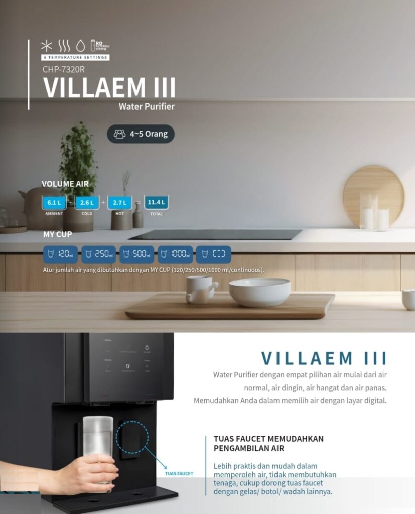 Coway Villaem III adalah jawaban bagi Anda yang mencari keseimbangan antara estetika, kesehatan, dan kepraktisan. Dengan sistem filtrasi terbaik dan kemudahan pengoperasian, produk ini menjamin setiap tetes air yang keluarga Anda konsumsi selalu dalam kondisi terbaik.